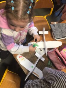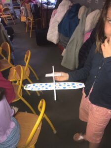 Nous avons eu l’intervention d’un animateur des Aventuriers de l’Air dans toutes les classes de l’école qui nous a expliqué comment volait un avion, le phénomène de la dépression, le rôle de l’air, des ailes, de la poussée des moteurs ! Et nous avons fabriqué des avions qui volaient bien !