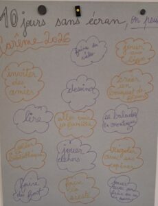 Dans le cadre du Carême en mars, nous avons organisé l’Opération 10 jours sans écran”: pendant cette dizaine de jours, il fallait ne pas utiliser les écrans: tablettes, TV, ordinateurs, téléphone portable, jeux vidéos…etc